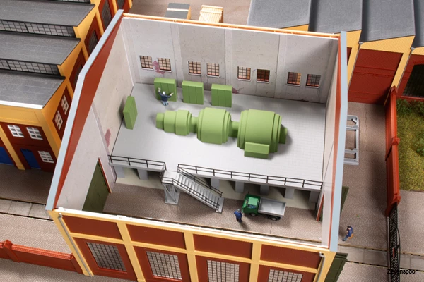 Ein weiteres Grundmodell unseres Baukastensystems. Eine der Besonderheiten sind die geraden Fensterstu?rze. Zur Stabilisierung liegen Ecken und Bodenplatten bei. Durch die großen Fenster kann man in den Innenraum hineinsehen. Eine weitere Besonderheit ist die beiliegende Dekoration aus Karton, mit der zunächst die Innenwände gestaltet werden können. Schilder, wie Rauchen verboten u. ä. schaffen noch mehr Vorbildnähe. Ein Blickfang ist aber der Tisch, der u?ber eine Treppe begehbar ist, mit Umformer und vier Schaltschränken. Die Geländer sind aus stabilem Karton in Lasercut-Technologie gefertigt. Das Falttor mit 4 Feldern kann auch in geöffnetem Zustand dargestellt werden und ist beweglich. Auch Außenleuchtenen liegen bei.