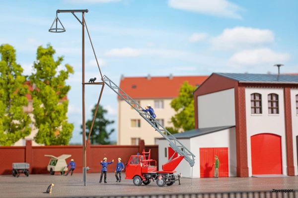 Bausatz. Mit vorbildgerechter Bereifung, Spiegel, Scheibenwischer, Hängerkupplung, Rundumleuchte sowie einer Dekoration mit Nummernschildern verschiedener Länder. Stu?tzen mit Fahnen werden mit einem Decal dekoriert und beim Einsatz benötigt. Die Vorderräder können auch eingelenkt dargestellt werden. Die Leiter ist dreh- und ausziehbar. Auf dem Decal sind auch verschiedene Beschriftungen zu finden.